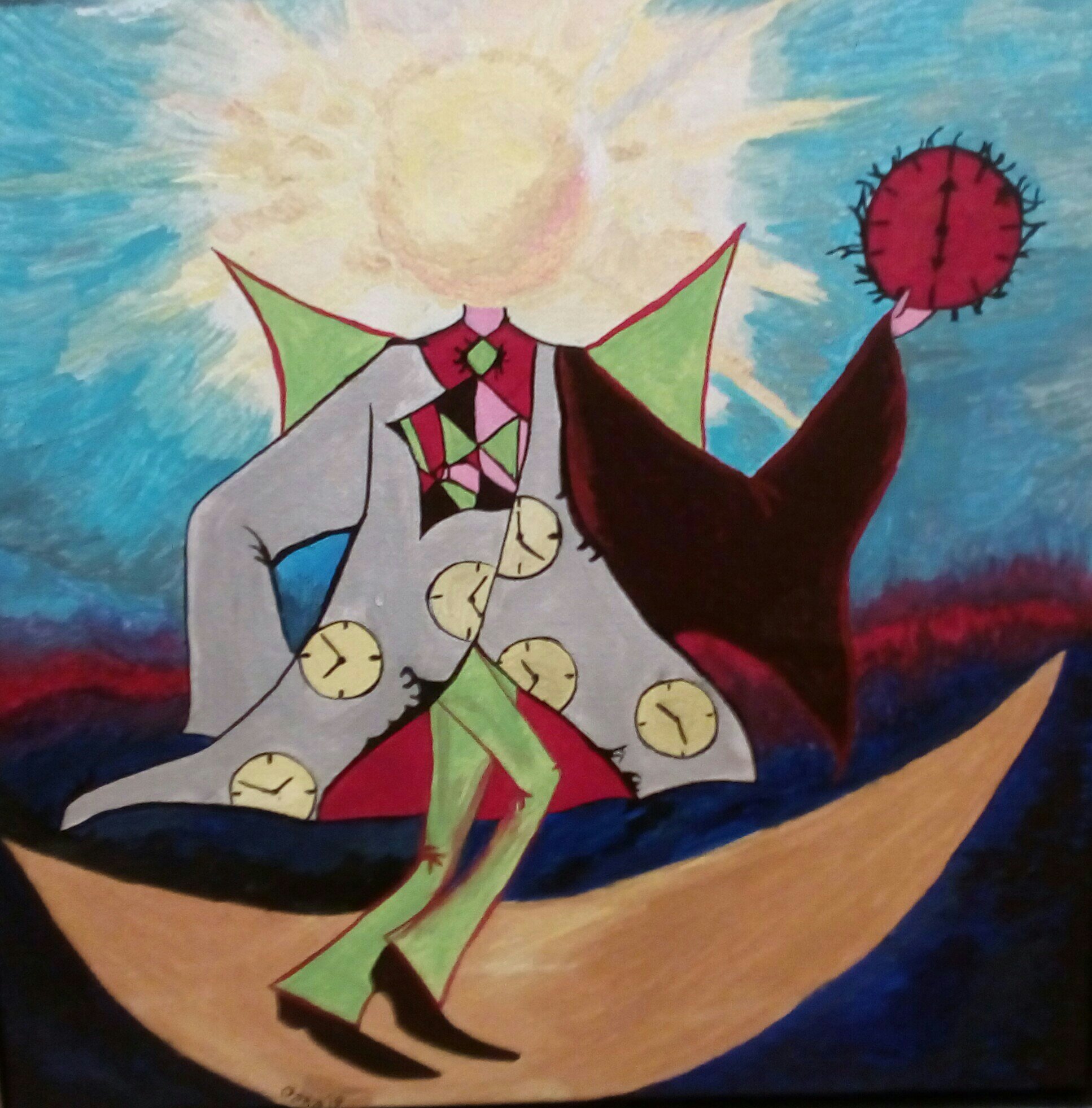 Then I started painting and it suddenly occurred to me that instead of a mask the “sun” can hold a clock. It all became quite clear afterwards – the sun, walking on the moon, reflecting its light. I was painting time. I added the contrast day-night on the background and there it was.