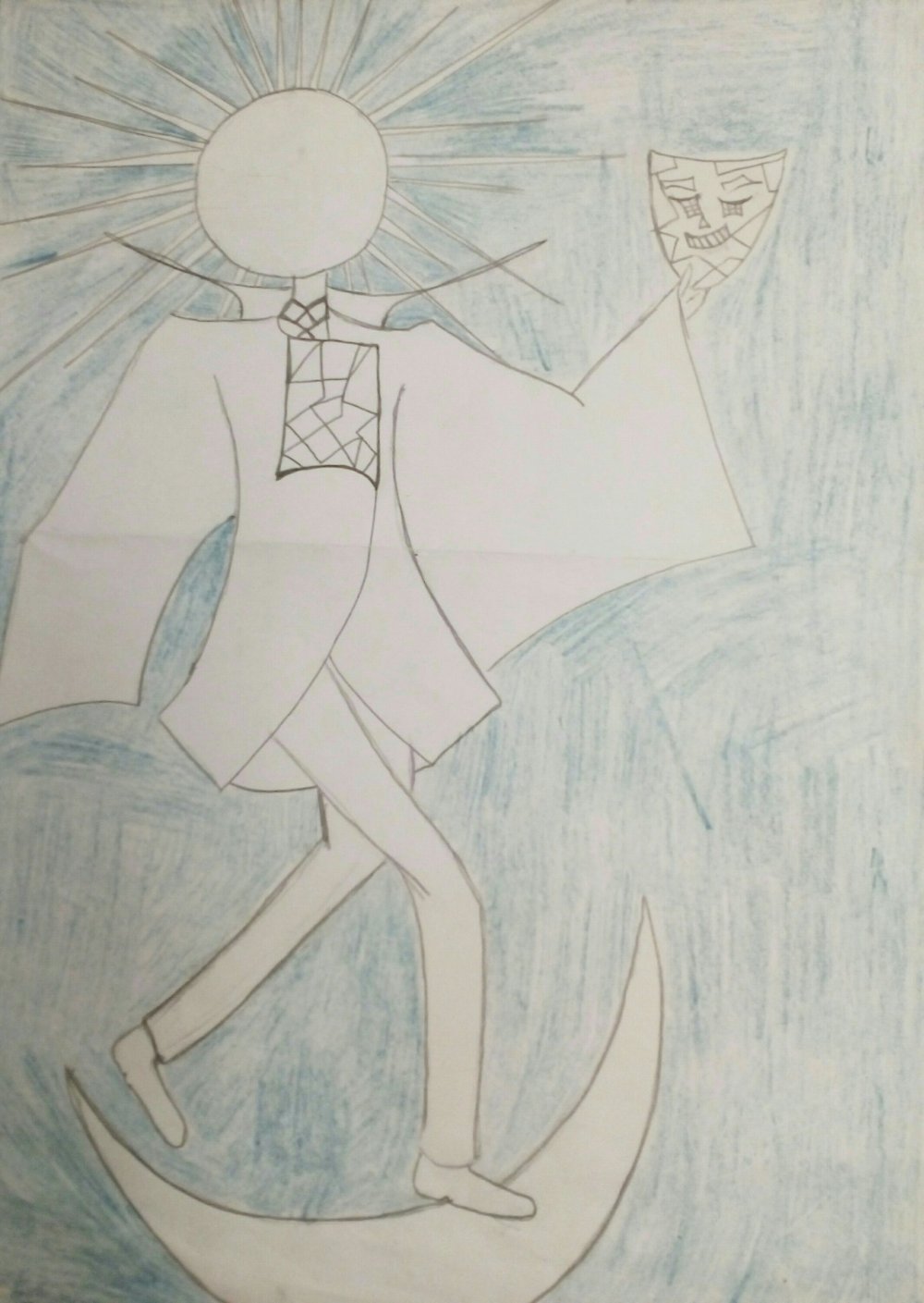 Initially, the idea behind the original sketch was too visualise the unexpected figure behind the mask. The sun itself.