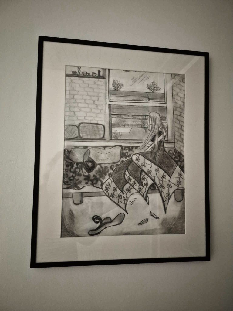The drawiong represents a girl from the dorm looking outside the window from the dorm’s common kitchen. It is inspired by the dorms of Ravnsbjerg Kollegiet, in Viby, Aarhus, Denmark.